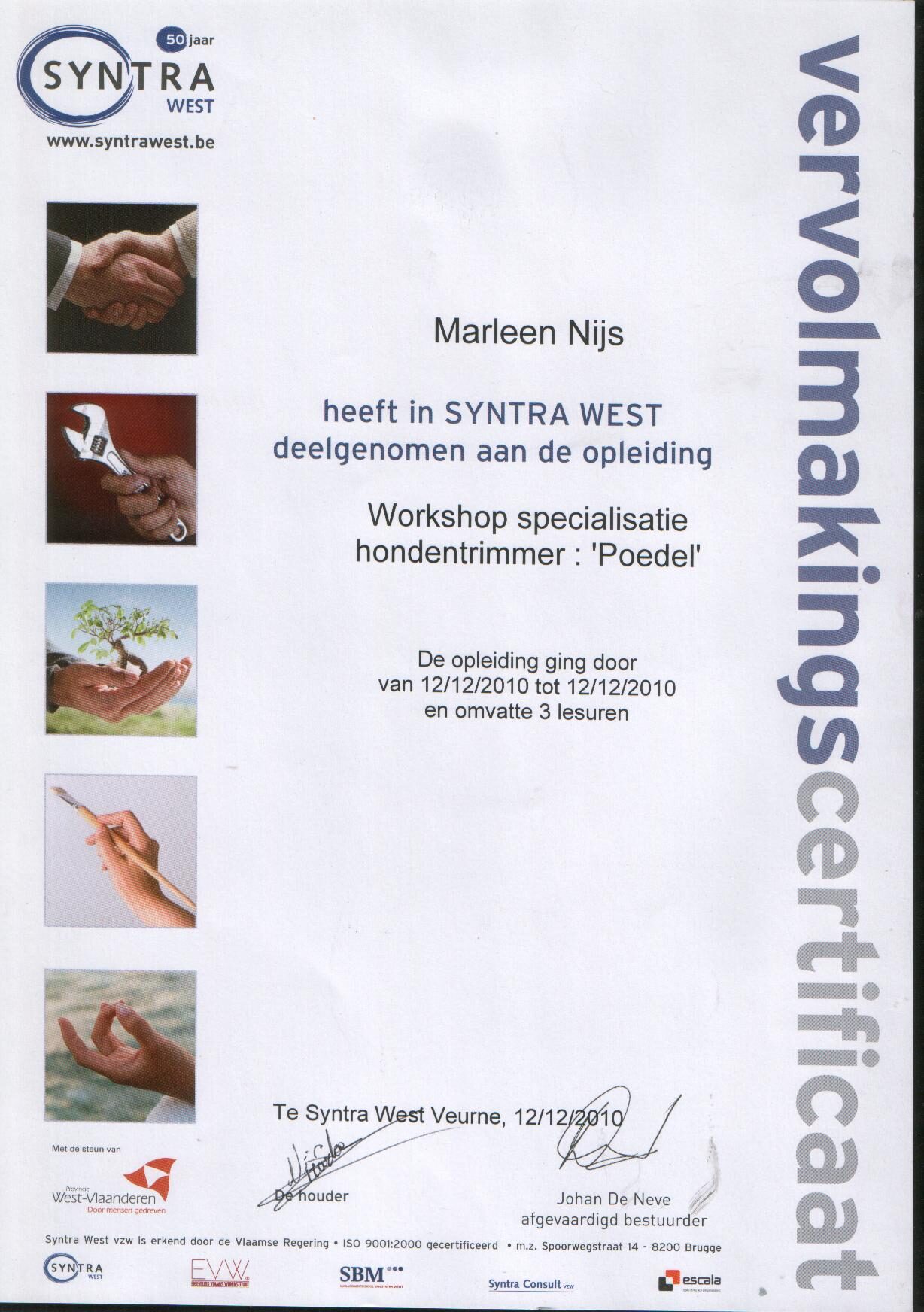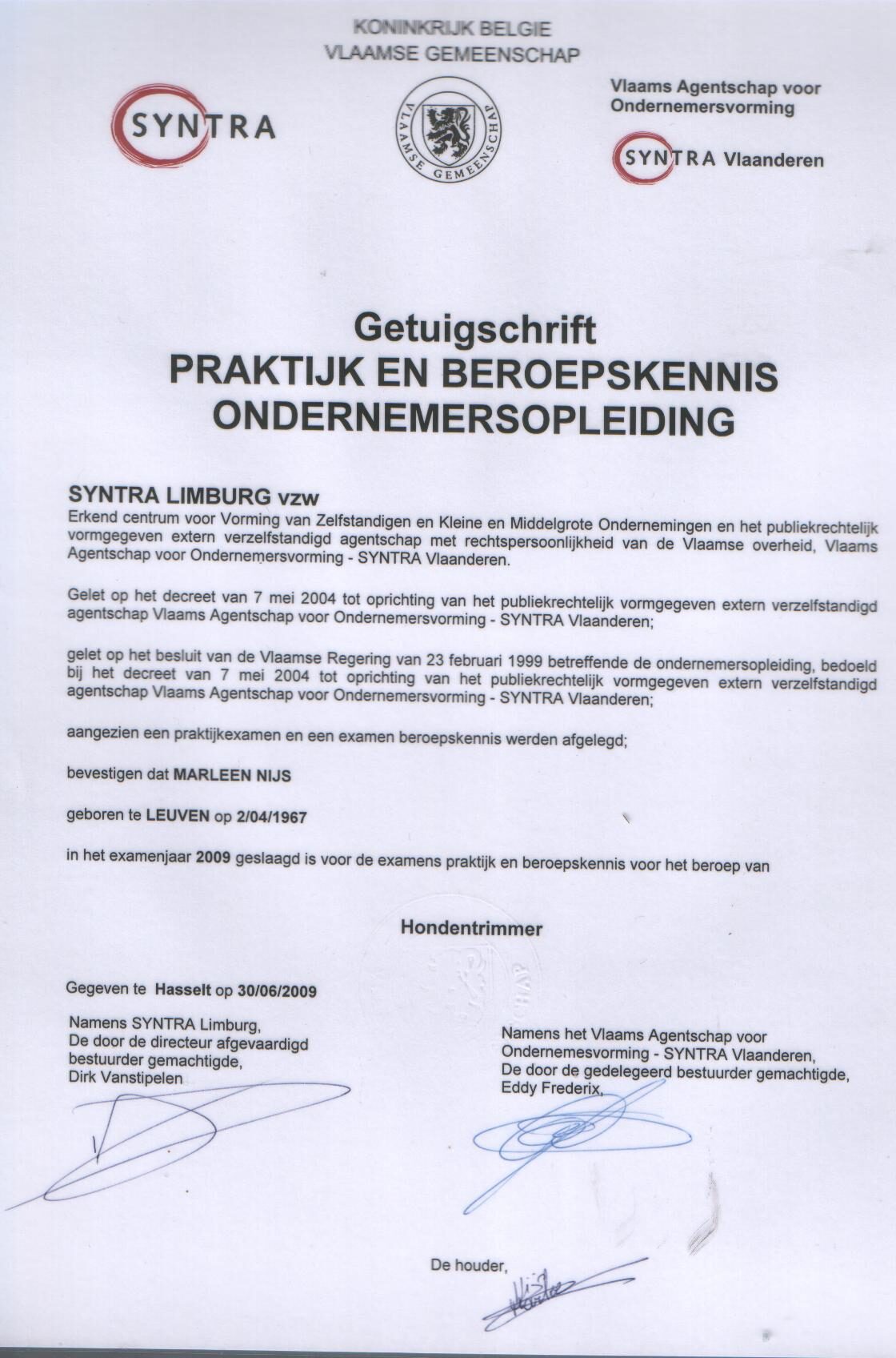 In September 2007 hakte ik de knoop door om mijn droom na te jagen en volgde ik een opleiding Hondentrimmen bij Syntra in Hasselt. Het waren twee pittige jaren waarin ik studeren combineerde met mijn hoofdberoep en huishouden – eerlijk is eerlijk: dat had ik wat onderschat.